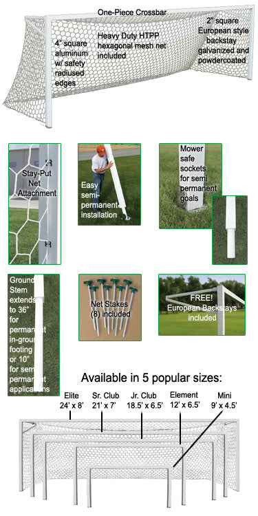 All Golden Goal permanent and semi-permanent units include free European Style backstays for added aesthetic appeal. Semi-permanent packages include our exclusive ground sockets with chrome plated cover lids. And don’t forget First Team always includes our heavy duty professional style hexagonal mesh net with every goal!