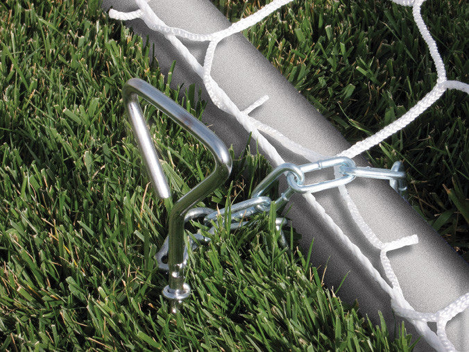 All Golden Goal soccer goals are manufactured to exacting specifications for a true, seamless fit throughout. The 4”x4” square aluminum uprights and crossbar are extruded with a safe ¾” rounded radius on the corners for safety. The uprights and crossbar are fully integrated with First Team exclusive “STAY-PUT” net attachment design. With “STAY-PUT” there are no velcro, welded hooks, screws, nylon ties or plastic clips. STAY-PUT is the first, fully integrated net attachment system for soccer. Simply weave the attachment rope into the attachment notches located throughout the goal structure. The net will “STAY-PUT” until you are ready to remove it and there are no clips, etc. to lose or misplace. With STAY-PUT the net always remains tight and true because there are no clips to slide out of place common with other manufacturers lines.