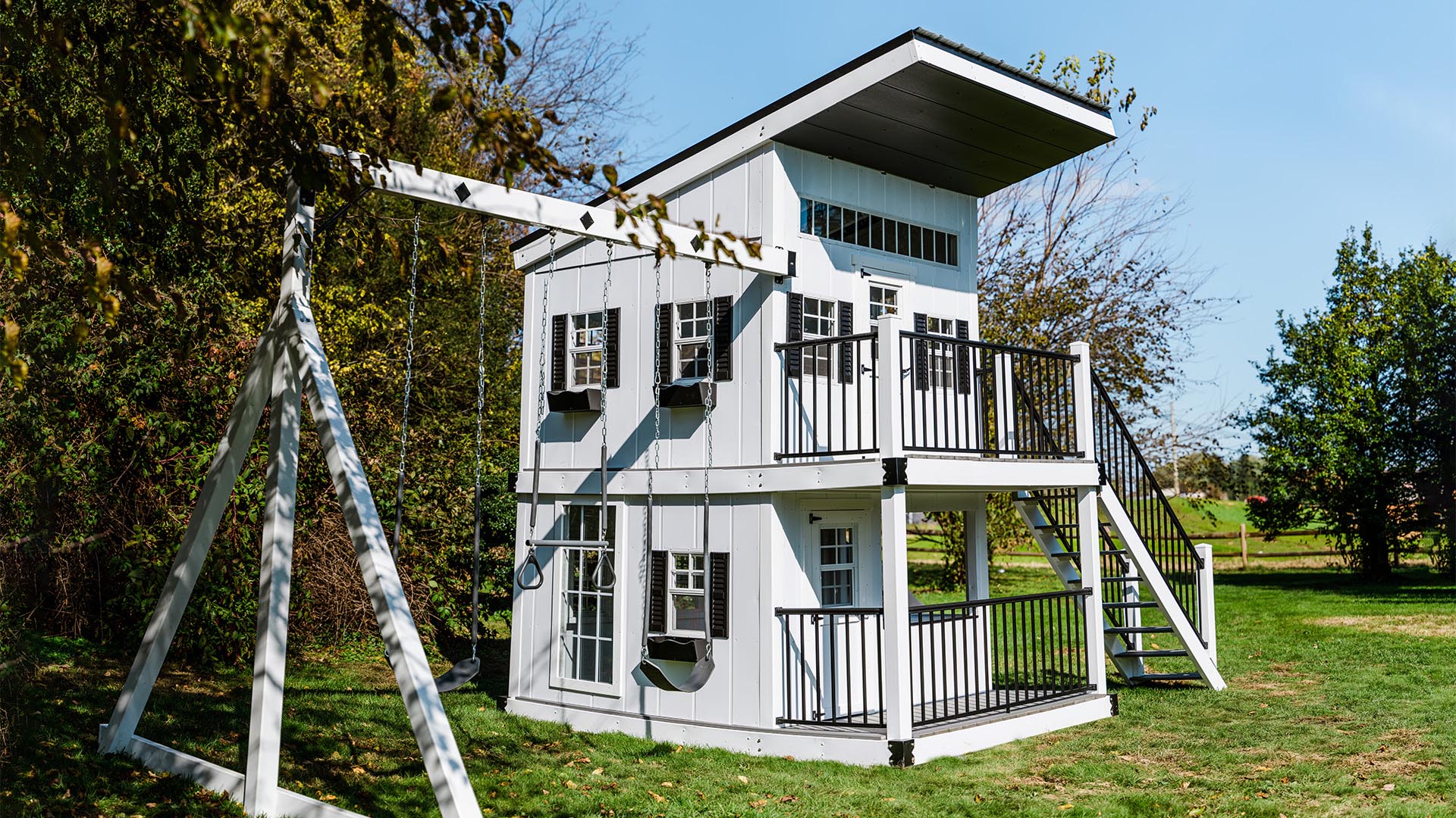 The Homestead is the first in our Elite Playhouse series. With aluminum handrails, a new roof design, and other new options, the Homestead is a stunning playhouse swing set.