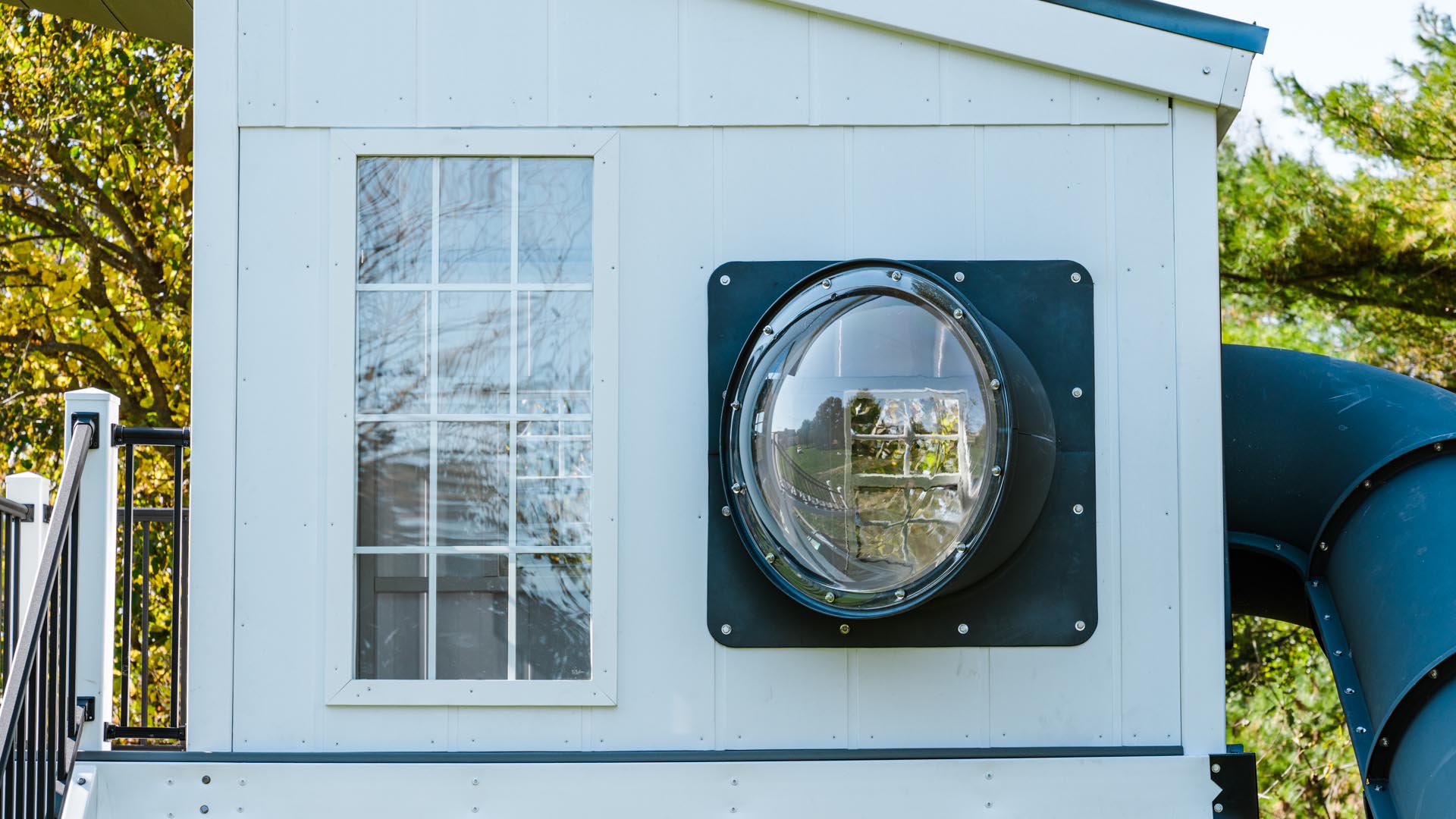 The Homestead is built on an 8’x11′ play deck with an 8′ x 8′ playhouse on the top and an 8′ x 8′ clubhouse on the bottom. This playhouse swing set has 2 large windows and 1 horizontal window along with the standard windows on our playhouse. This ensures the interior of the playhouse is lit up nicely and also allows parents to see into the playhouse.