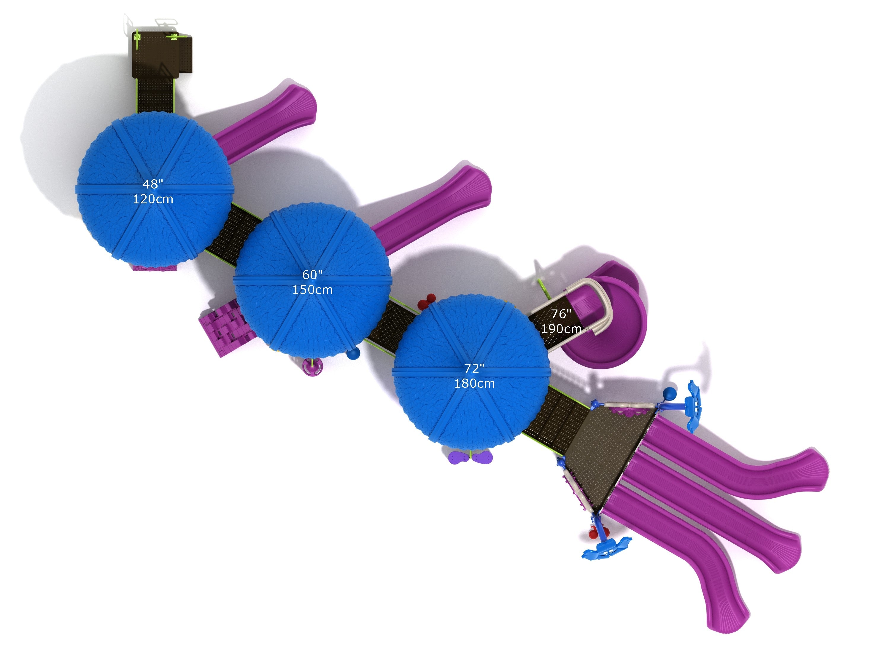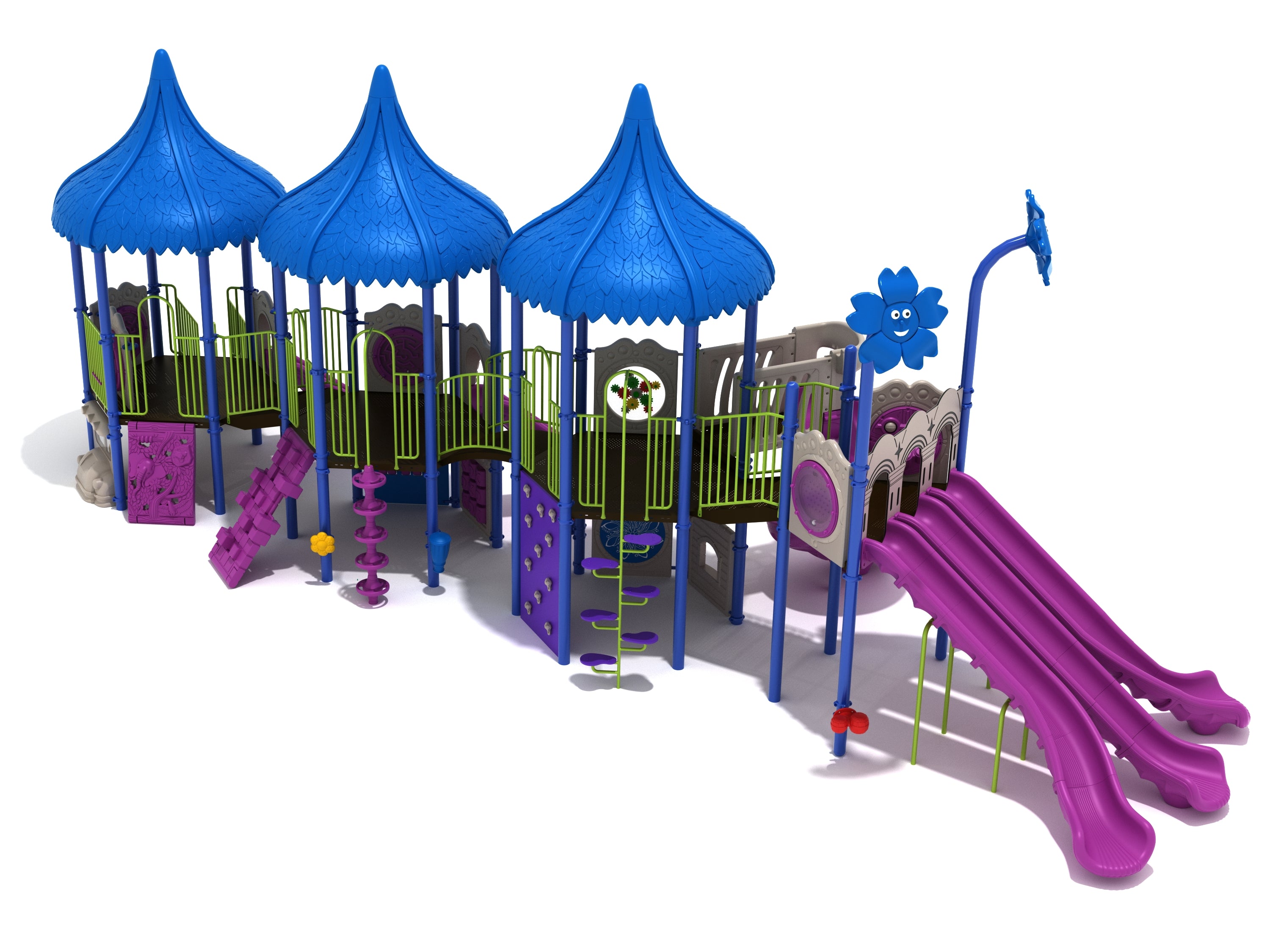 Here, there are even more activity panels, a unique Bones Bridge, and four different slides with different heights to provide different levels of intensity. Towering proudly over the playgrounf are our grandiose Hex Bulb Roofs and Sunshine posts!