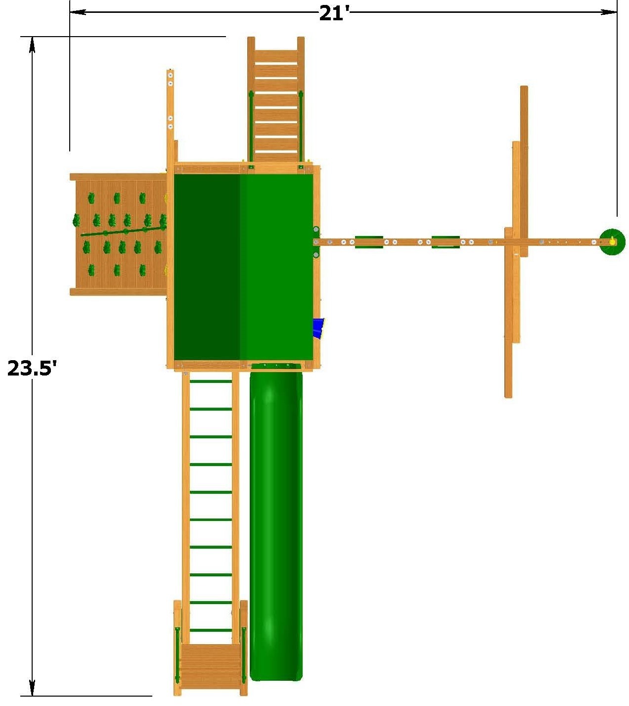 Coming off the back of the main deck is a safety ladder with safety handles. Next to that is a trapeze arm for extra swinging fun. Off the side is a full sized rock wall with climbing rope for extra climbing fun. Up top, the main deck is 7′ x 5′ and comes with a ship’s wheel.