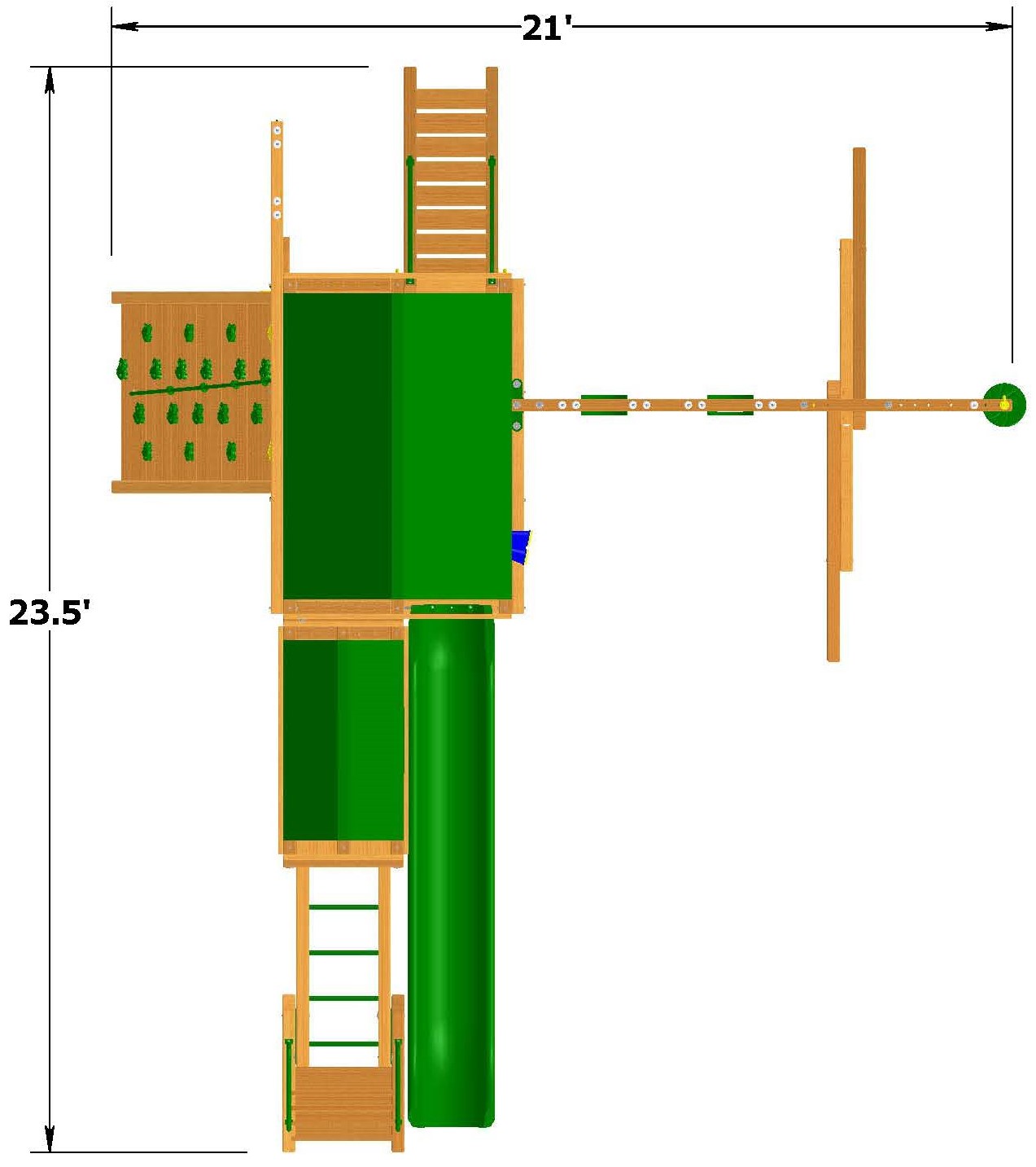Coming off the front of the Extreme Fort Combo 4 7.5′ high deck we have a huge 15′ slide and solid monkey bars with a sky loft.