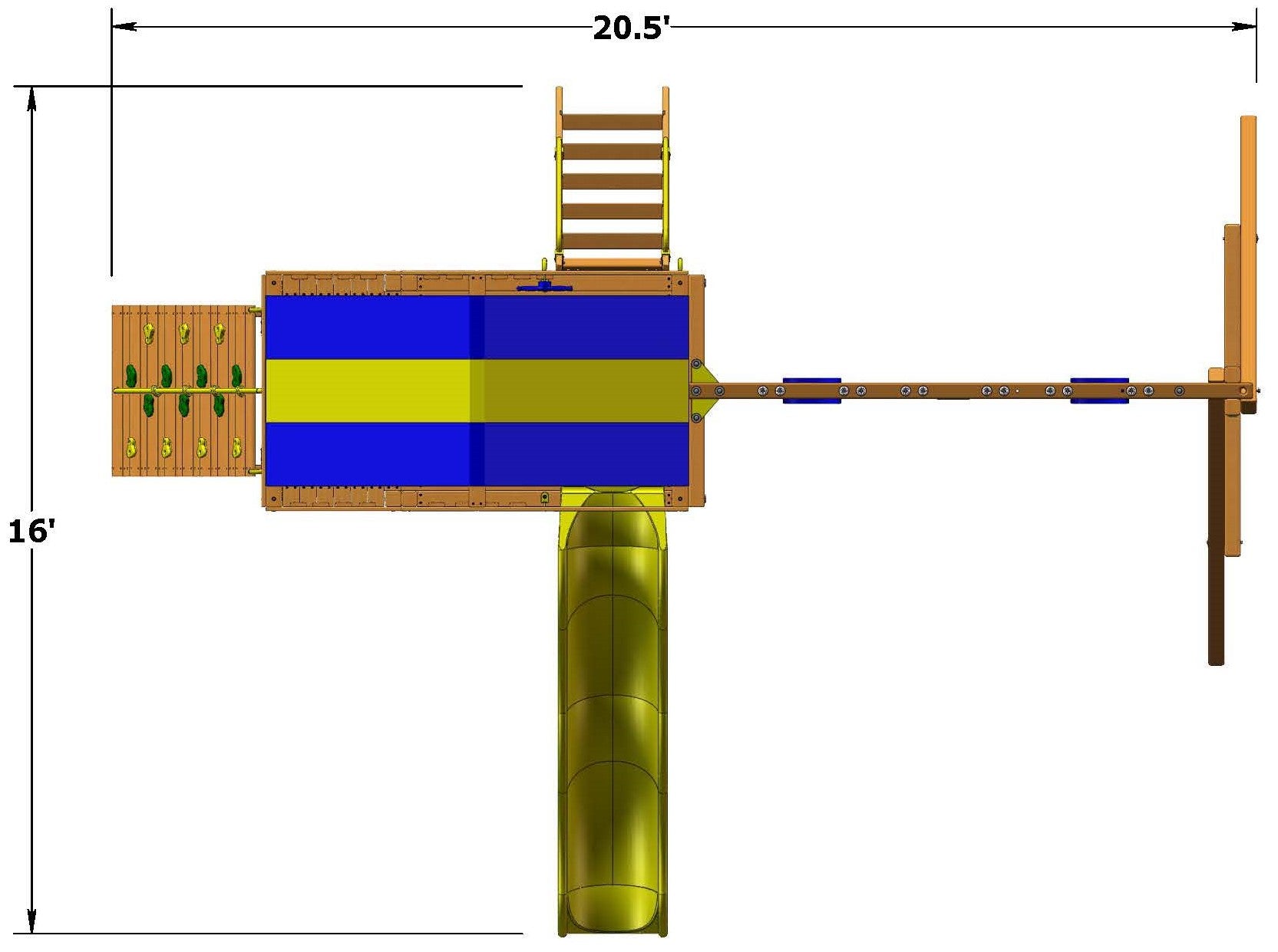 Coming off the back of the main deck is a safety ladder with safety handles. Off the side is a full sized rock wall with climbing rope for extra climbing fun. Up top, the main deck is an XL 7.5′ x 4′ and comes with a ship’s wheel.