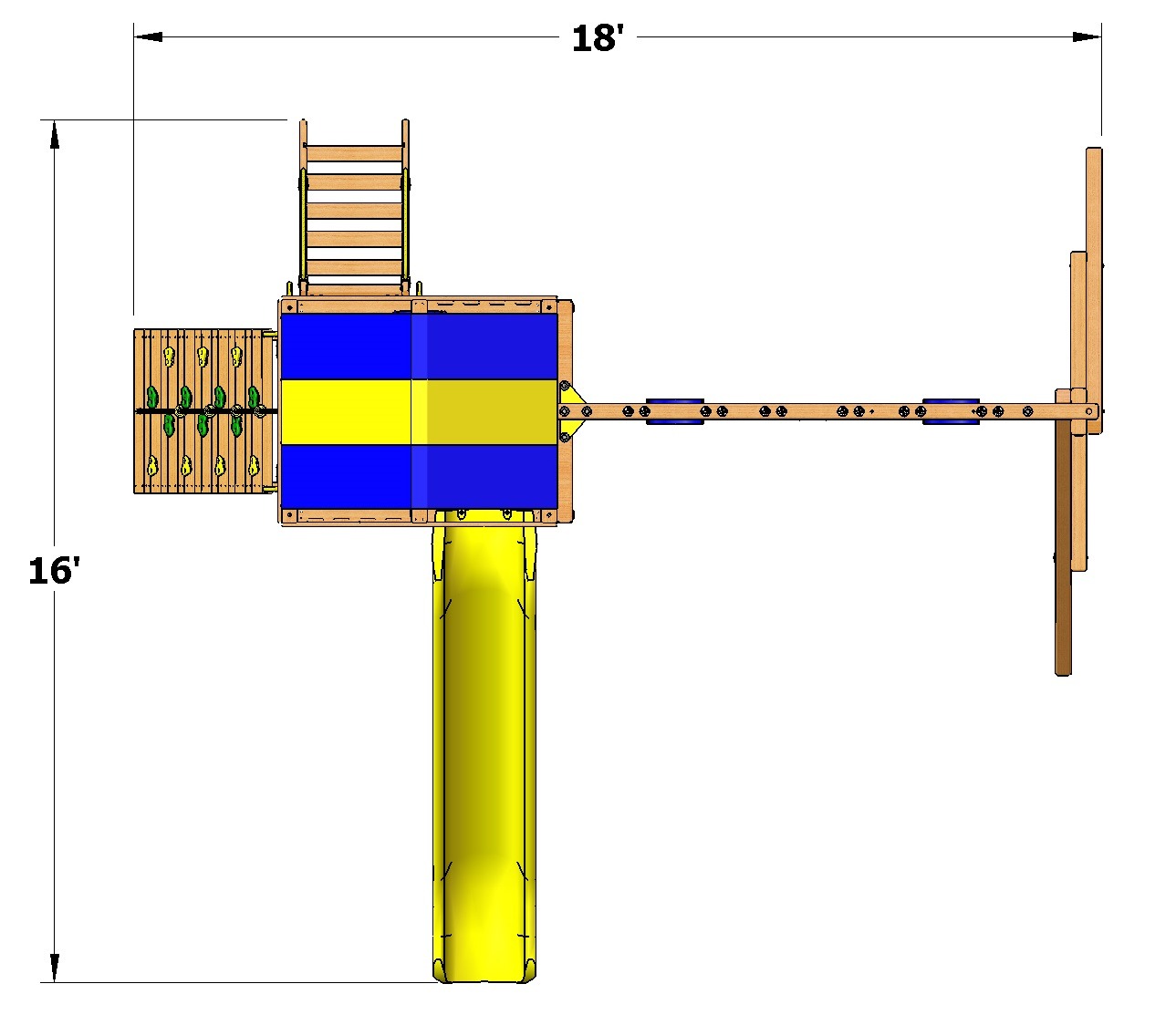Off to the other side of the main deck a massive 4″ x 6″ wooden swing beam that comes with 2 belt swings and a trapeze bar for extra swinging fun!