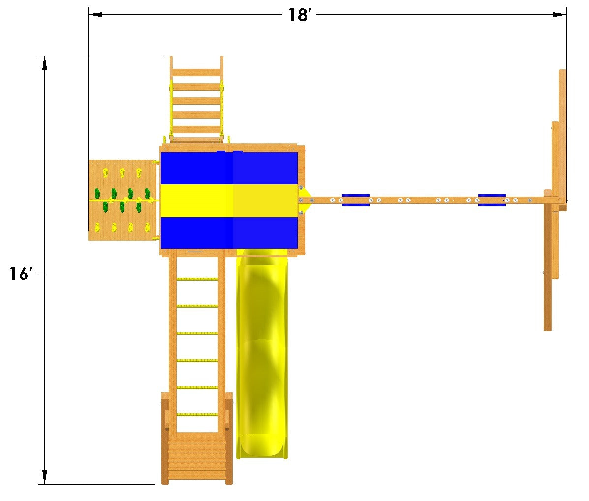 Off to the other side of the main deck a massive 4″ x 6″ wooden swing beam that comes with 2 belt swings and a trapeze bar for extra swinging fun!