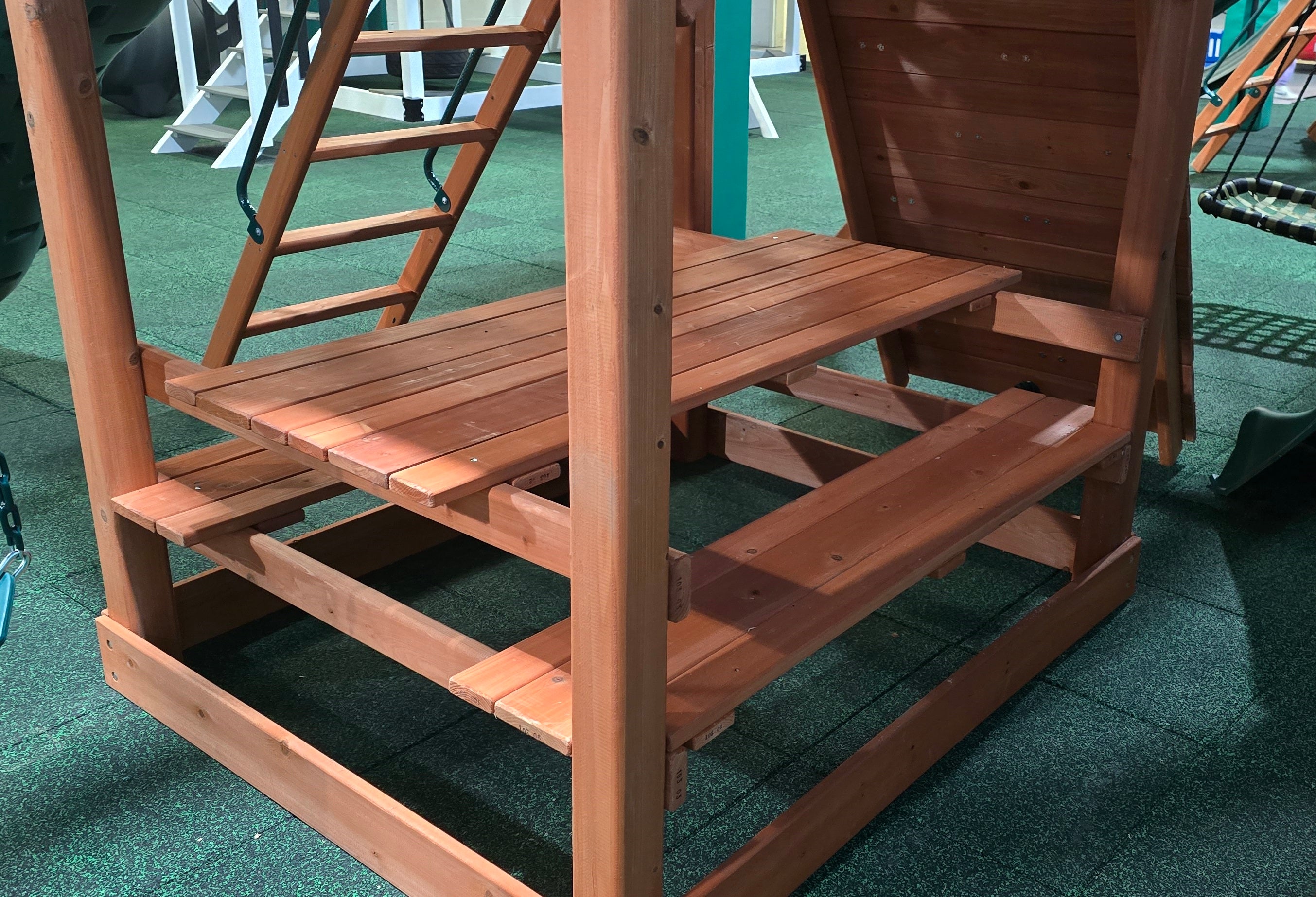 Off to the other side of the main deck a massive 4″ x 6″ wooden swing beam that comes with 2 belt swings and a trapeze bar for extra swinging fun!