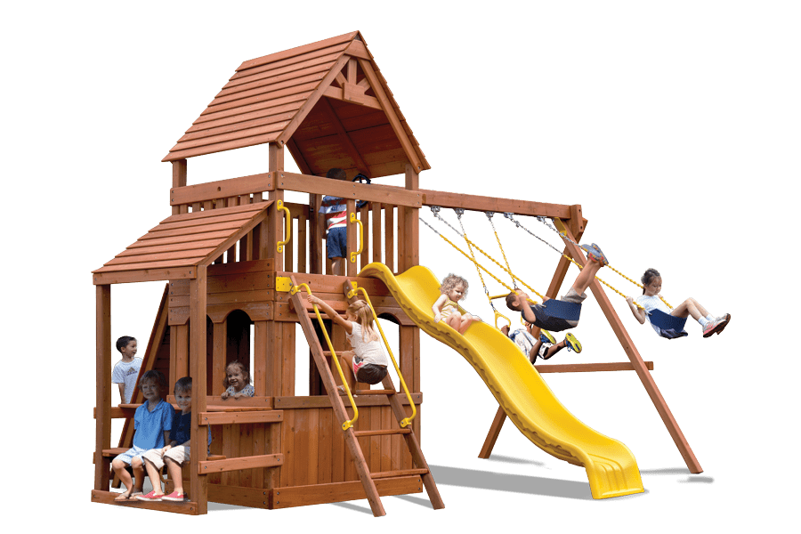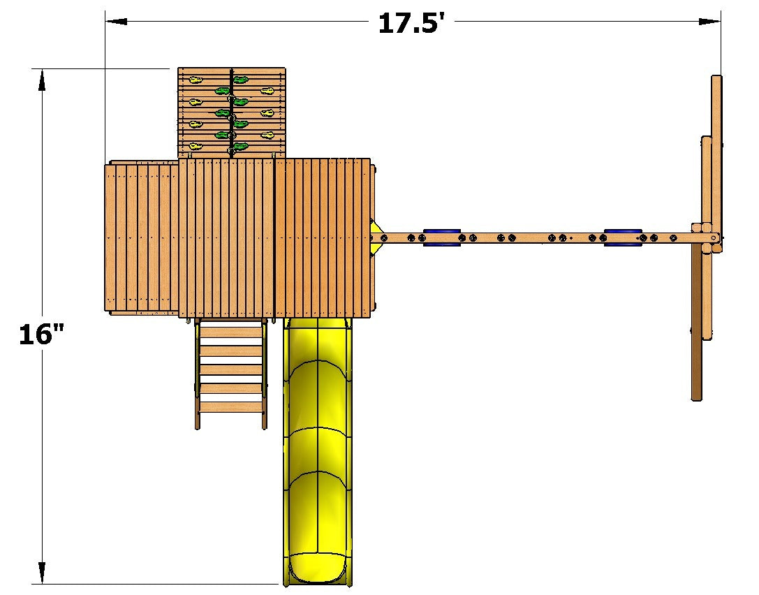 Off to the other side of the main deck a massive 4″ x 6″ wooden swing beam that comes with 2 belt swings and a trapeze bar for extra swinging fun!