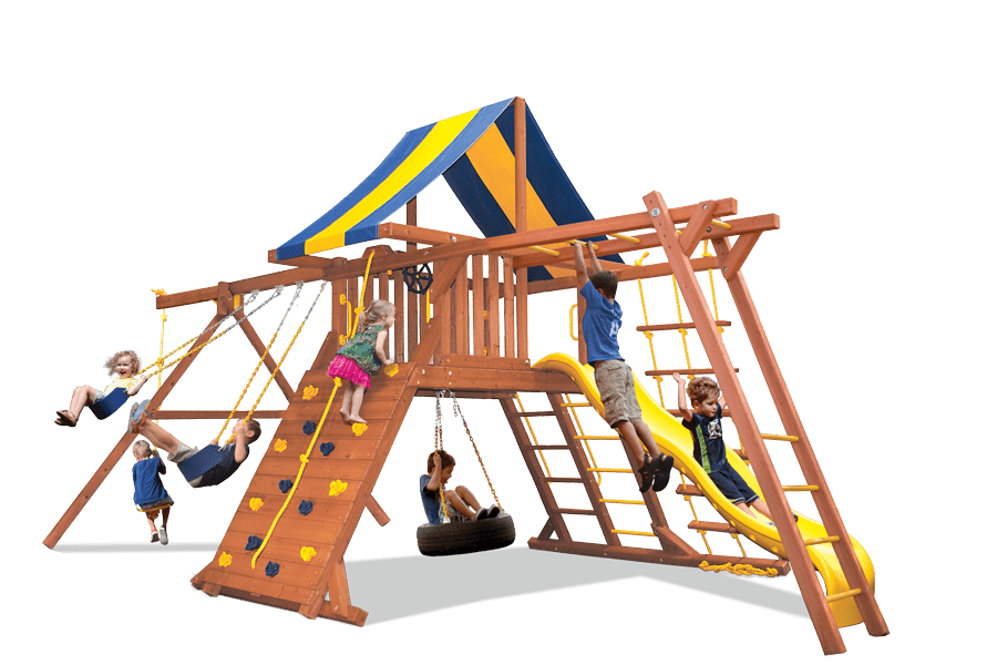 The Original Playcenter Combo 3 is a mid-sized swing set with a 5 foot deck height – so it can accommodate small children AND its big enough to accommodate your children as they grow older. The biggest draw of the Original Playcenter Combo 3 is its angled base (or A-Frame style base) – so it gives your children a larger rock wall and enough room to add a tire swing underneath! With the addition of monkey bars it makes this set one of the best, feature rich bang’s for your buck!