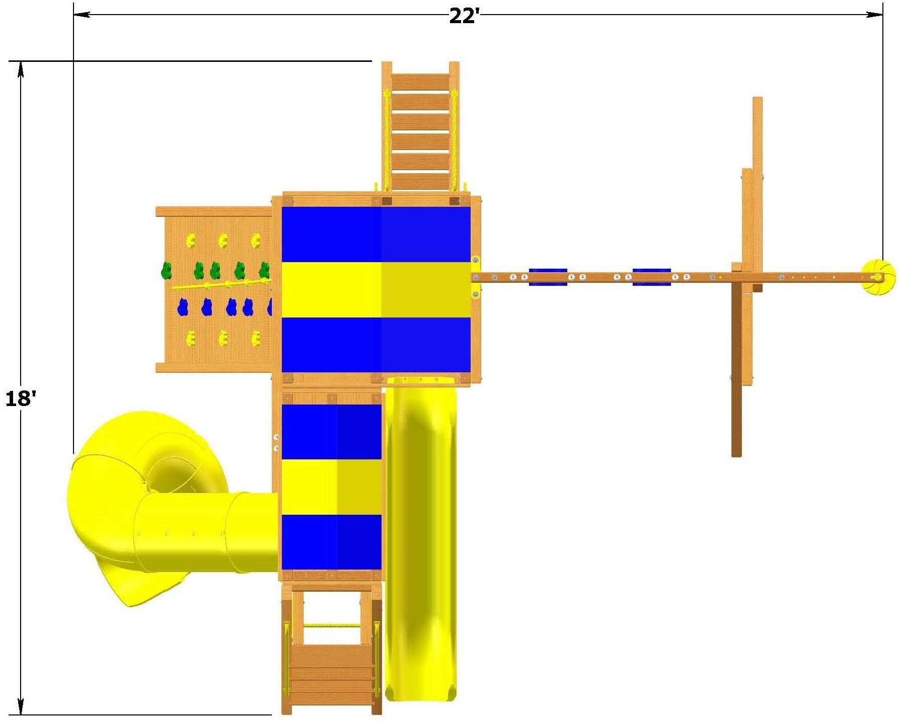 Coming off the front of the main deck we have an 11 foot slide. Next to that are the monkey bars with Sky Loft and spiral tube slide! This trio makes for endless days of high climbing and sliding!