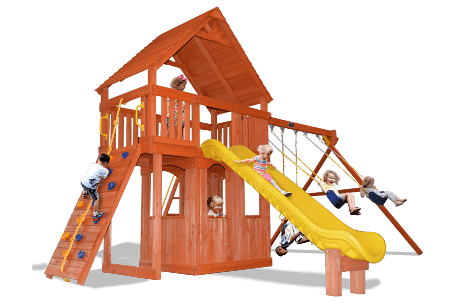 Ready..set..go! The all new Playground One® Turbo Original Fort XL with Playhouse has taken our best selling original fort series to new sizing. Made to grow into and definitely not out of this fort boasts a 50% Larger playdeck at the 5’6″ deck height with an 8’6″ swing beam height. We’ve then paired all that with a super fast 11′ slide. To make this Swingset even more attractive check out the added wood roof and Lower playhouse! Our promise to you… Nothing compares!
