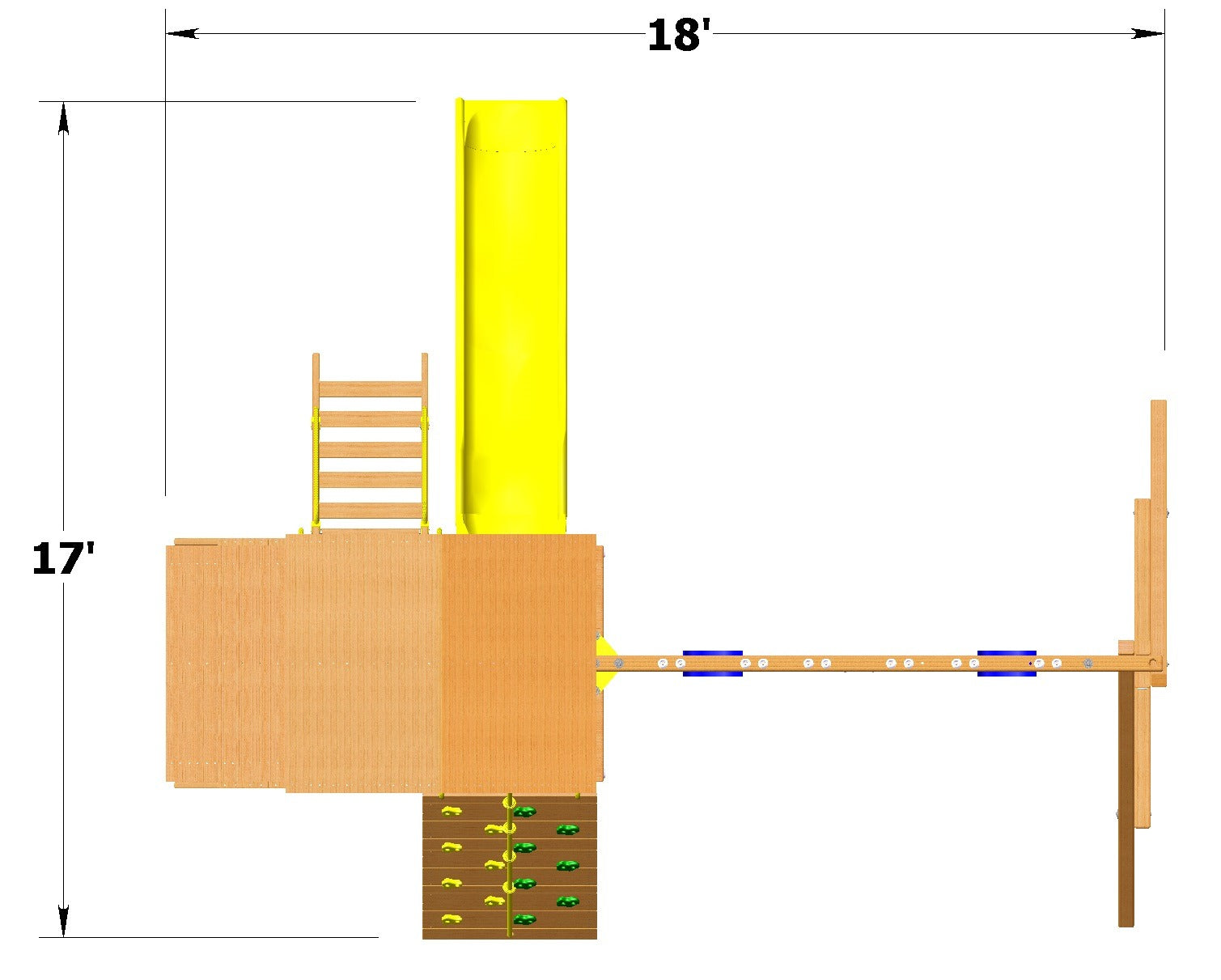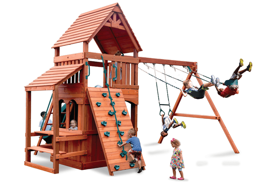 Off to the other side of the main deck a massive 4″ x 6″ wooden swing beam that comes with 2 belt swings and a trapeze bar for extra swinging fun!