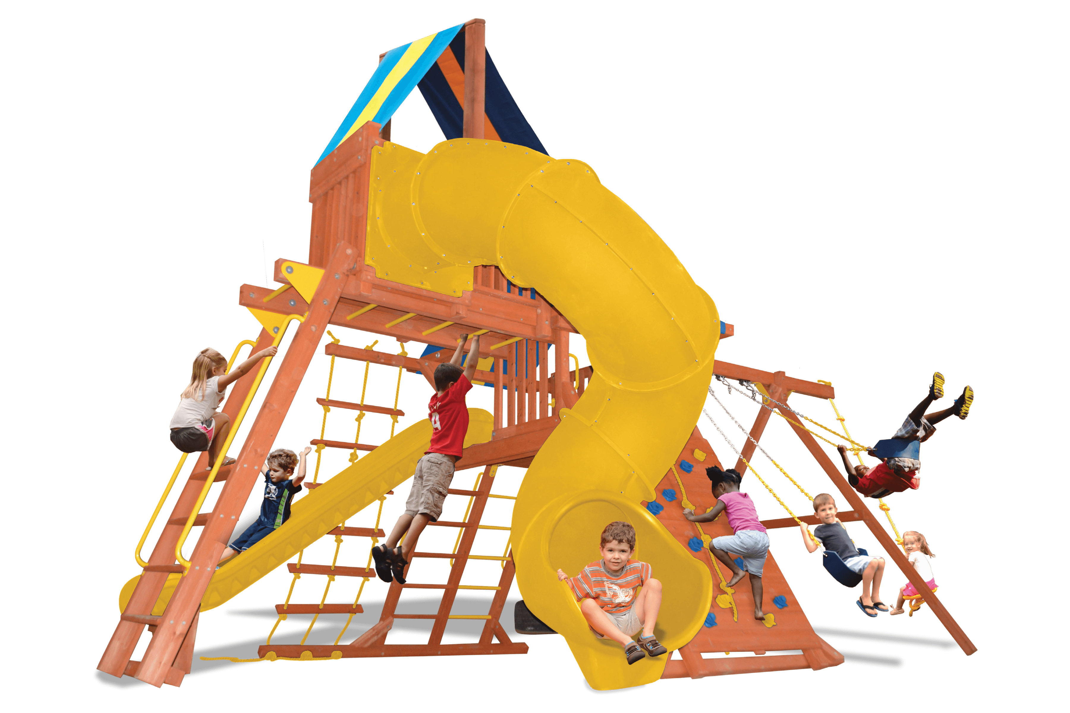The sets come standard with 2 belt swings and a trapeze bar. The Playground One Turbo Original Playcenter Combo 5 comes in Cedar, it has a 5 1/2 foot main deck and an angled base . For more on those features, please read our comprehensive blog post here: