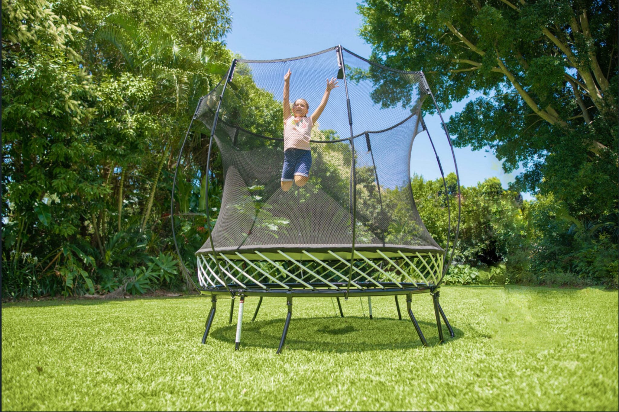 Our Springfree® 8ft Round Trampoline and Safety Enclosure is designed for lighter jumpers and for smaller back yards. Our 8ft mat jumping surface is equivalent to a traditional 10ft trampoline but takes up the space of a traditional 8ft trampoline – so you maximize your jumping surface and save valuable backyard space.